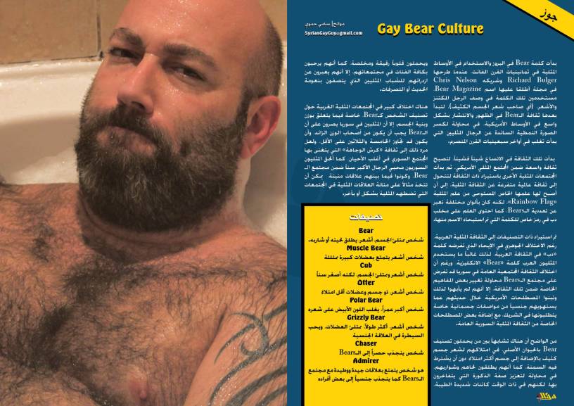 أماكن تجمعهم في سوريا: إنهم في كل مكان… حيثما تلتفت، تجد «Bear»… في المقاهي، في الحانات، في البارات، وفي أماكن التجوال المثليّ، قد يعتزلون بقية المثليين مكونين دائرتهم الخاصة التي تجمعهم، فتدخل إلى مقهى لتجدهم يجلسون على طاولة يعتزلون فيها الآخرين، كما أن لهم حمامهم الخاص بهم، وكانت لديهم حفلات خاصة، مخصصة لهم ولمحبيهم… بشكل عام، ينطبق تصنيف «Bear» على معظم الرجال السوريين، غيريين أو مثليين، حتى لتظنّ أن «كرش الوجاهة» هو أحد شروط الجنسية السورية.