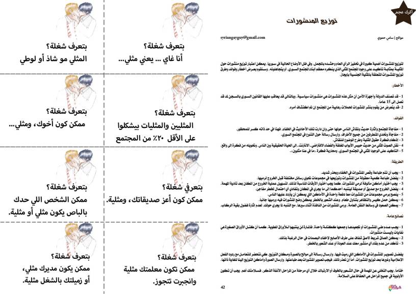 لتوزيع المنشورات أهمية كبيرة في تحفيز الرأي العام وحشده بالمجمل، وفي ظل الأوضاع الحالية في سوريا، يمكن اعتبار توزيع منشورات حول المثلية بمثابة تأكيد على وجود المجتمع المثلي الذي ينكره معظم أبناء المجتمع السوري، أو يتجاهلونه، وسنقوم بعرض أخطار وفوائد وطرق توزيع المنشورات المتعلقة بالمثلية الجنسية بإيجاز.